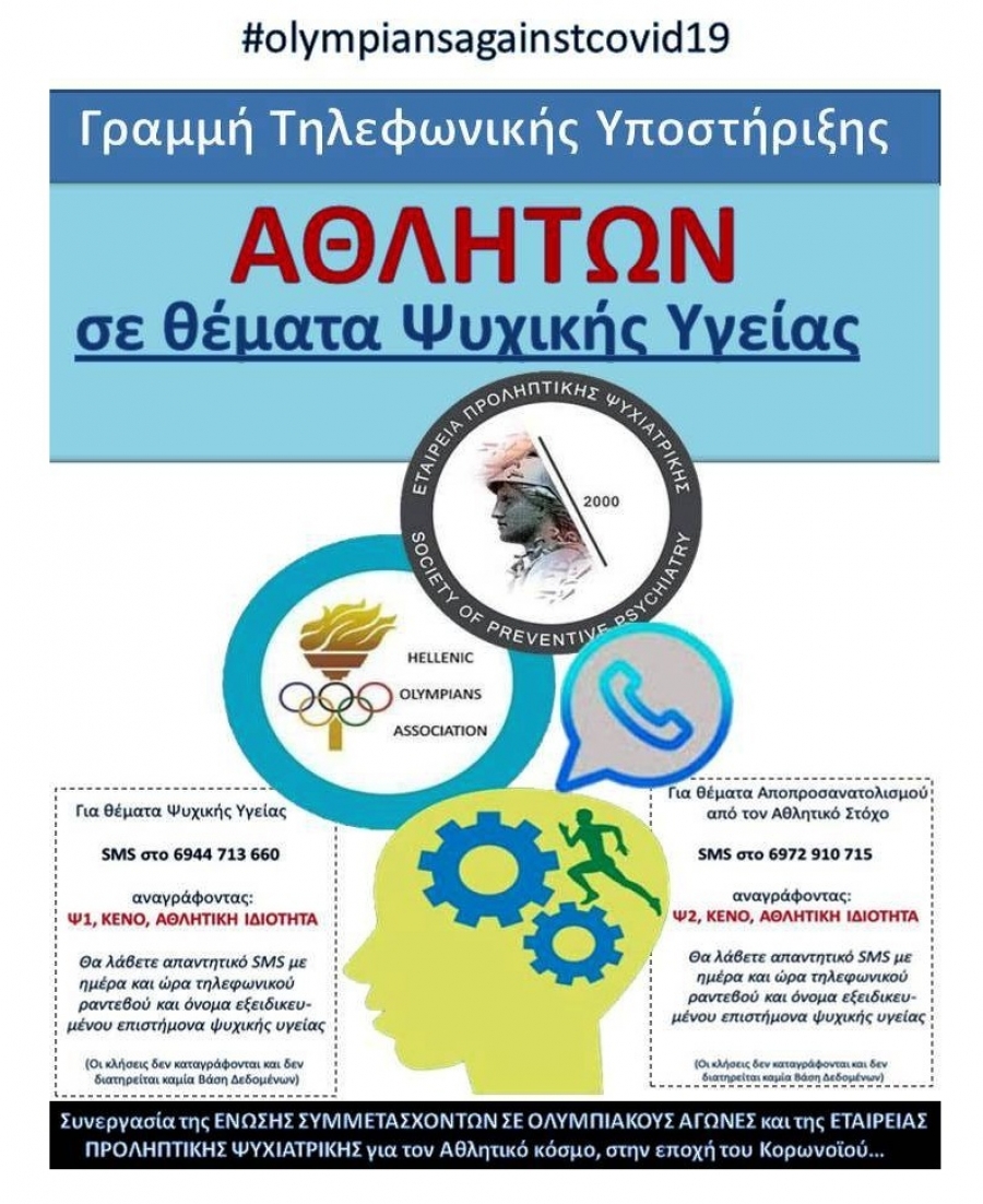 Η Ένωση Συμμετασχόντων σε Ολυμπιακούς Αγώνες, (ΕΣΟΑ) στα πλαίσια της εκστρατείας #olympiansagainstcovid19, εξασφάλισε την συνεργασία της Εταιρείας Προληπτικής Ψυχιατρικής, όπου προεδρεύει ο ομότιμος Καθηγητής Ψυχιατρικής του Πανεπιστημίου Αθηνών κ. Γεώργιος Χριστοδούλου, ως προς την δημιουργία μίας τηλεφωνικής γραμμής υποστήριξης αθλητών σε θέματα ψυχικής υγείας.