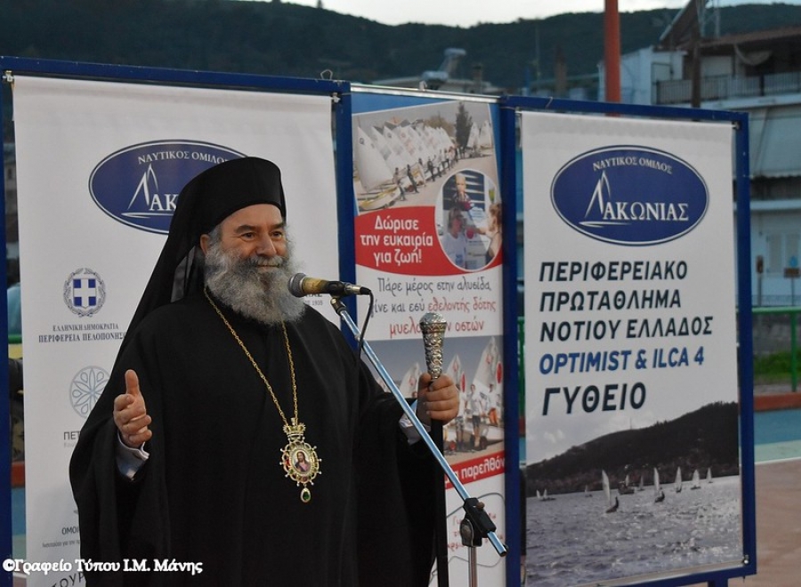 Ο Σεβ. προ της απονομής των επάθλων κατά την ομιλία του είπε τα εξής: «Ο Θεός, μας έδωσε την τρίτη ημέρα της Δημιουργίας την θάλασσα. «Καὶ εἶδεν ὁ Θεὸς ὅτι καλὸν» η θάλασσα. Και μείς οι άνθρωποι Τον δοξάζουμε για το υπέροχο αυτό δώρο και την χρησιμοποιούμε ποικιλότροπα. Όχι μόνον για ναυτικούς, εμπορικούς και άλλους ευεργετικούς και εθνικούς σκοπούς αλλά και για τροφή μας με τα διάφορα είδη ψαριών. Ακόμη η θάλασσα προσφέρει αθλητικούς και ψυχαγωγικούς στόχους. Έτσι και η ιστιοπλοΐα, δηλαδή η πλεύση με ιστιοφόρο, είναι ένα ωραίο άθλημα, ευγενές και συναρπαστικό. Αξίζουν θερμά συγχαρητήρια σ’ όλα τα παιδιά, τους ιστιοπλόους αλλά και στους προπονητές και τους γονείς τους που αγάπησαν την θάλασσα, τα ίστια και τον άνεμο. Επαινώ ακόμη τους άξιους ιστιοπλόους για το θάρρος, την τόλμη και την αντοχή τους στο αγώνισμα αυτό. Εύχομαι ο Χριστός μας, που αγάπησε την θάλασσα, που περπάτησε πάνω στα κύματα, που την ηρέμησε με μια Του λέξη «σιώπα», να σας ευλογεί και να σας χαρίζει υγεία και κάθε πρόοδο στη ζωή σας».