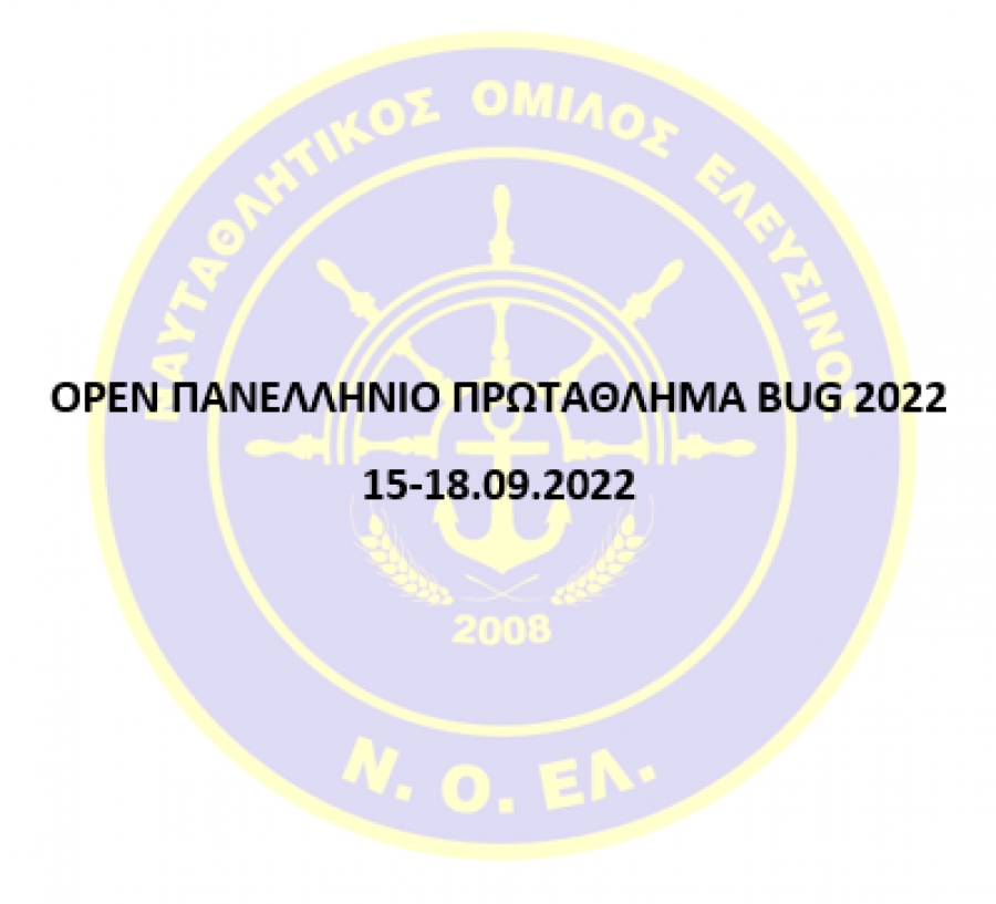 Το Open Πανελλήνιο Πρωτάθλημα της κατηγορίας Bug για το έτος 2022 θα πραγματοποιηθεί στο Ναυταθλητικό Όμιλο Ελευσίνας από 15 έως και 18 Σεπτεμβρίου 2022.